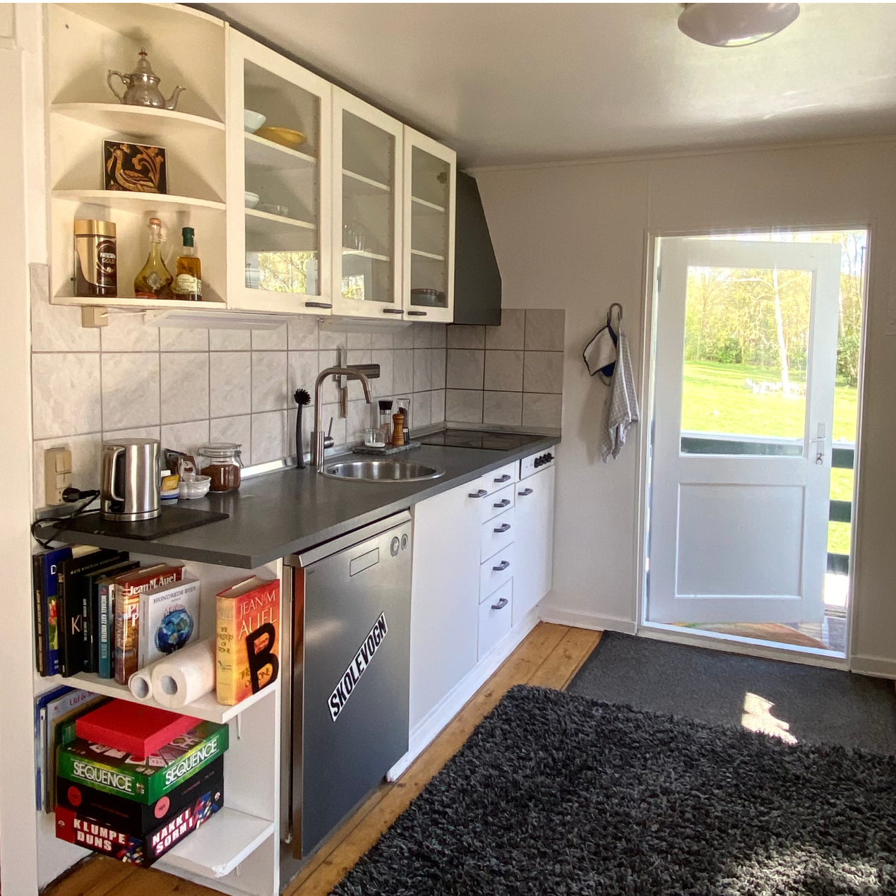 Køkkenet er fuldt udstyret med komfur, mikroovn, kaffemaskine, elkedel og amerikanerkøleskab. Rummet indeholder desuden et spisebord og (sove-) sofa med mulighed for opredning til yderligere 2 personer.